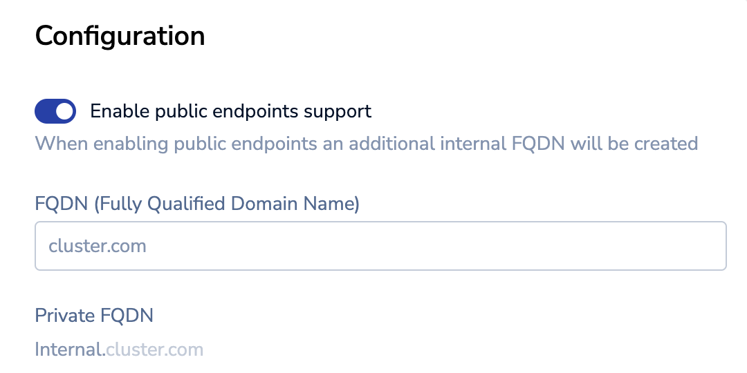 When doing so, the cluster creates an additional FQDN, e.g. internal.cluster.com for private network (e.g. VPC or an internal network), while the cluster.com FQDN can be used by a public network (e.g. the internet).